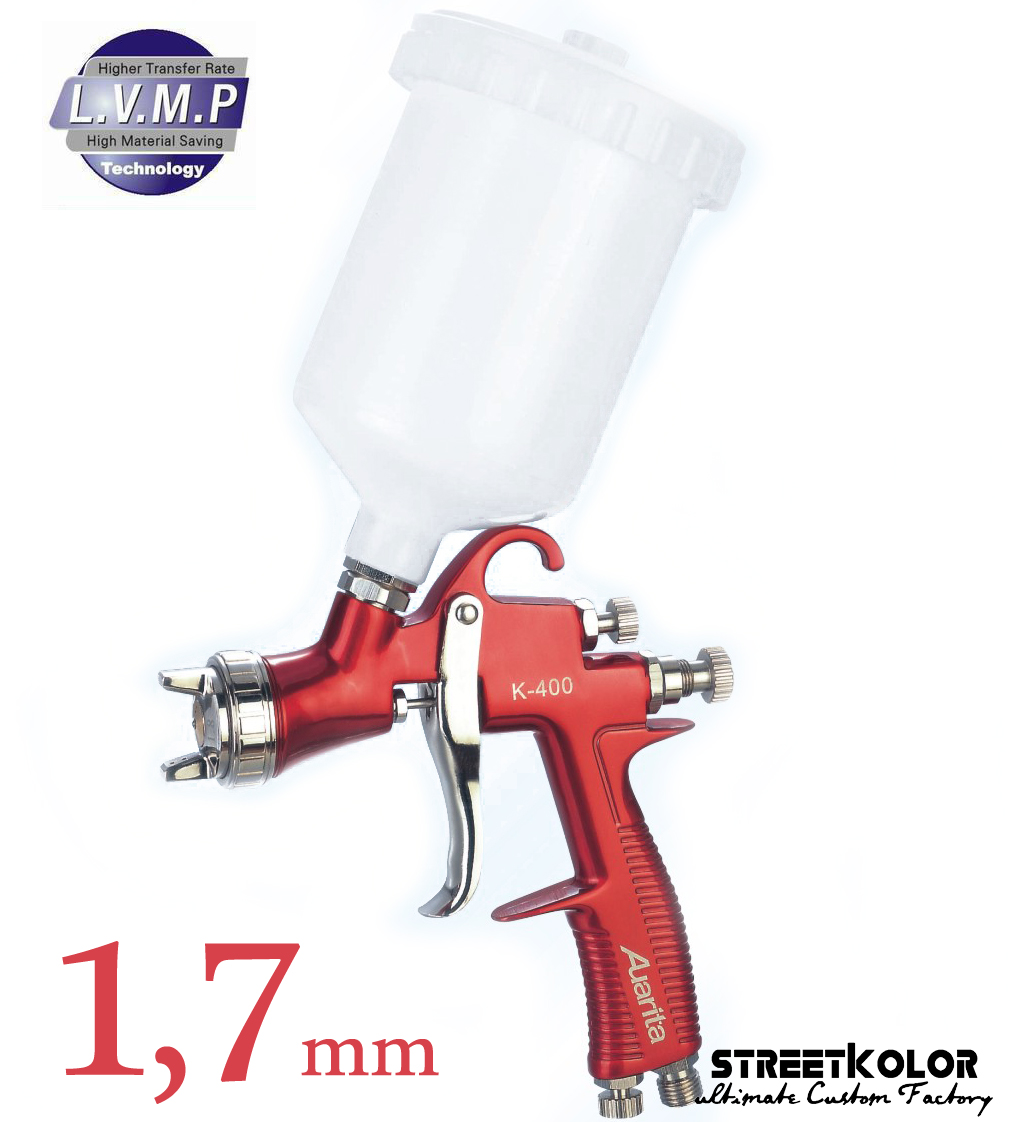 Striekacia pištoľ LVMP Auarita K-400 je ideálna pre profesionálne striekanie s ihlou a tryskou 1,7 mm. Je vhodná najmä pre Polyuretán, syntetiku, alkydové laky, moridlá, striekací tmel, plniče, husté farby a laky s vyššou viskozitou a pod. .