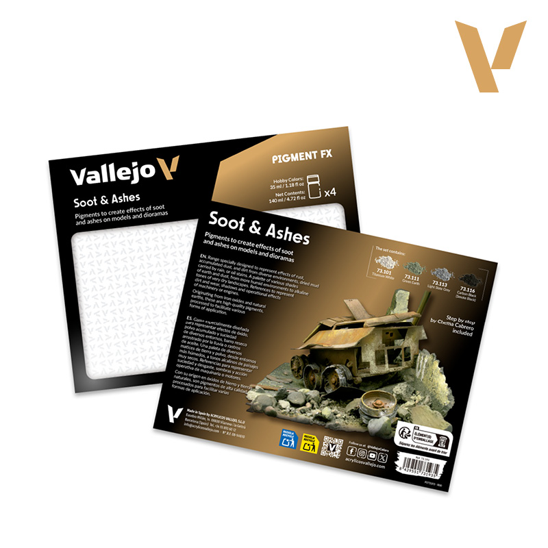 Pigmenty Vallejo to gama naturalnych i syntetycznych pigmentów, wybranych ze względu na ich stabilność, doskonałą światłotrwałość oraz wyjątkowo drobne mielenie cząsteczek. Specjalny zestaw tematyczny "Soot and Ashes" dostarcza modelarzom paletę odcieni niezbędną do autentycznego odwzorowania skutków pożarów, wybuchów, spalonych wraków oraz osadów dymnych.